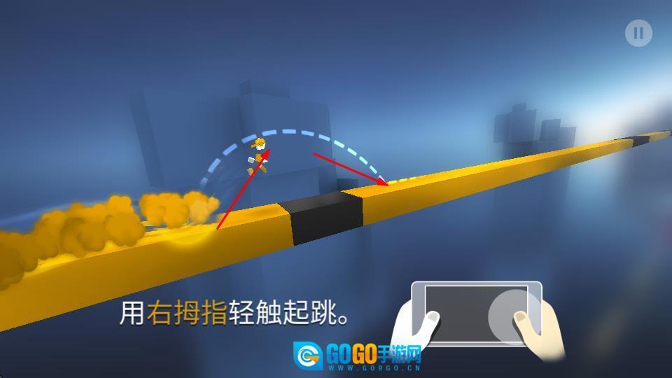 进入游戏后,用右手拇指轻轻触碰屏幕就能让角色跳起来,避开黄黑条纹的平台障碍,正式开启闯关之旅。