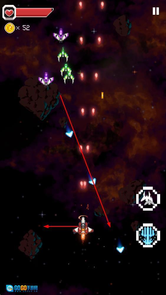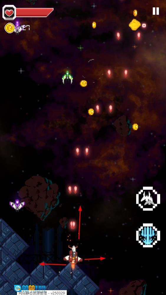 进入太空场景后,操纵飞船进行左右上下的移动,避开敌人发射的红色弹幕,与此同时对准绿色、紫色之类的敌机展开攻击。