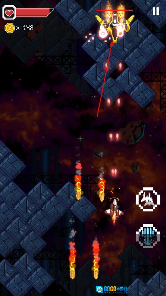 随着游戏进程的推进,玩家会遇到大型Boss敌机。此时需要躲避它密集的火焰弹幕,同时集中火力攻击Boss。击败Boss后,玩家将获得大量金币奖励。