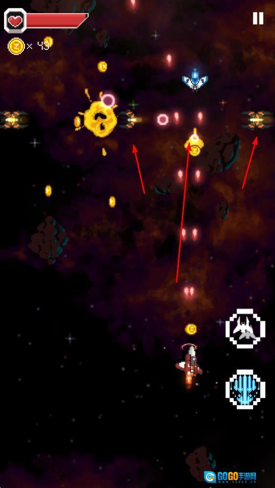 在飞行途中,收集场景里的金币和特殊道具,积累资源以提升飞船的作战能力,为接下来的挑战做好准备。
