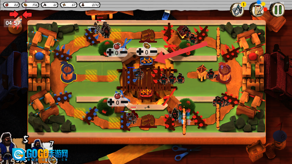 资源的采集与管理操作如下:点击地图上的加减号按钮即可派遣工人,其中上下两路适合采集食物(因路程较近,耗费时间少),中路则用于采集黄金(路程相对较长,所需时间也更多);此外,还能通过食物来兑换黄金。