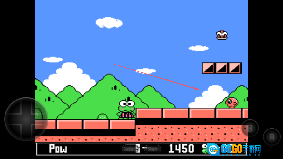 通过屏幕左下角的虚拟十字键操控大眼蛙移动,借助跳跃动作避开空中的骷髅头。
