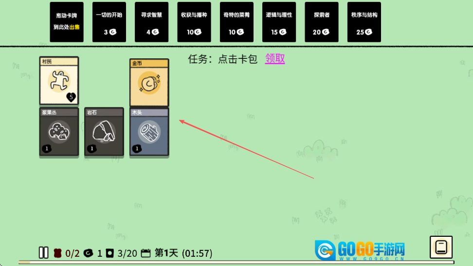当前需关注屏幕上方的任务,依旧是点击卡包进行领取;随后确认界面中的卡牌分布情况;最后将金币拖动至村民的下方位置。