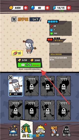 在兵营界面中,先选中“孩子王”角色,当达成0/20的进度要求以及2000的资源条件后,点击【升级】按钮,即可实现角色属性与战力的提升。