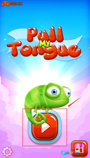 变色龙下方红按钮标注点击区域,引导游戏开始。