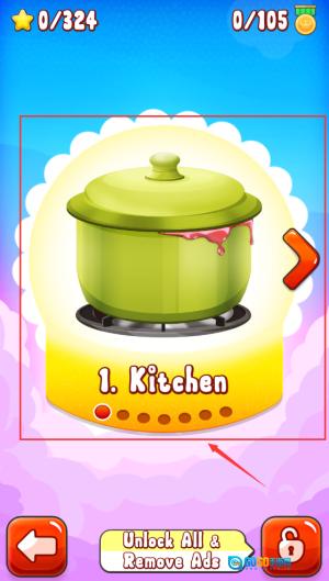 红框标注带血渍锅具,提示厨房关卡解锁条件。