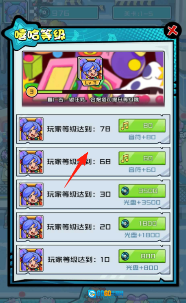 通过等级养成系统提升“嘻哈等级”,当达成“玩家等级6级”等指定条件后,可领取音符、光盘等奖励,用于强化角色能力。