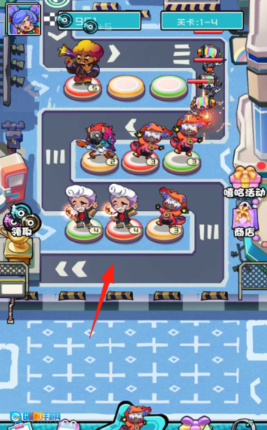 在“关卡1-4”的战斗中,布置嘻哈类角色(歌手、舞者),通过组成特定阵型来抵御敌人进攻,逐步推进战斗波次。