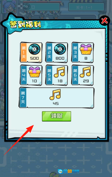 参与“签到福利”活动可领取福利,连续登录能获得音符(第7天45个)和道具,点击“领取”按钮即可积累资源。