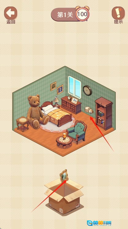 在新手关卡的卧室场景中,把四处散落的衣物与书籍分别整理收纳到衣柜和书架里,以此完成你的首次整洁任务挑战。