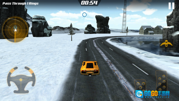 操控黄色飞行车,通过屏幕按键控制方向与加速;当遇到“PassThrough1Rings”任务时,需瞄准空中的蓝色圆环,切换至飞行模式(点击翅膀图标)进行穿越,且要在限定时间内完成该任务。