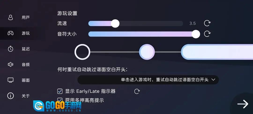 2、游玩设置模块可以调整流速,音符大小以及重试方式,此外还有指示器和多押提示选项。玩家可以多次调整流速和音符大小来找到自己心仪的配置。