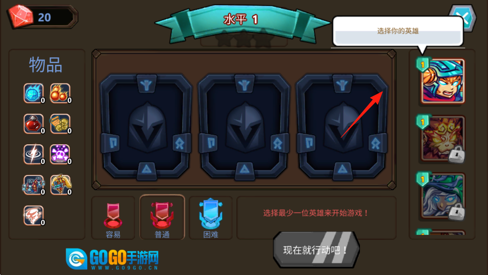 英雄选择功能位于“水平1”界面,操作时需消耗20个水晶,玩家可从右侧已解锁的英雄卡牌中挑选角色,以此来组建自己的队伍。