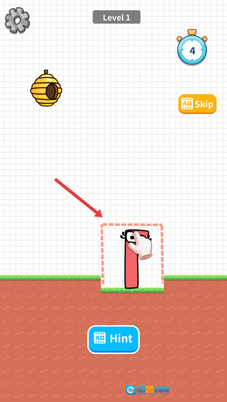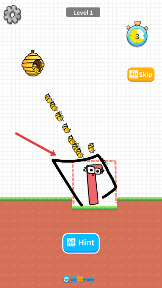 防御成功触发:蜜蜂被图形阻拦,成功守护红色竖线,顺利通过第一关。