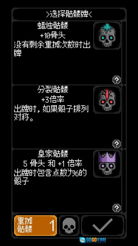 骰子组合玩法:每个组合要尽可能激活更多骷髅,借助重掷来争取所有优势。对成功的组合进行强化,以此增强你的牌组,使其能应对越来越严峻的挑战。