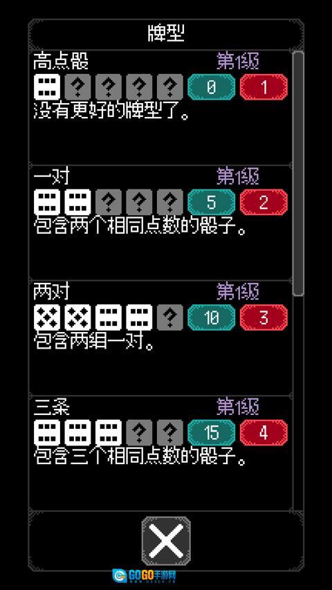 玩家需要借助掷骰子的方式来组建牌组,不同的牌型所对应的得分存在差异。