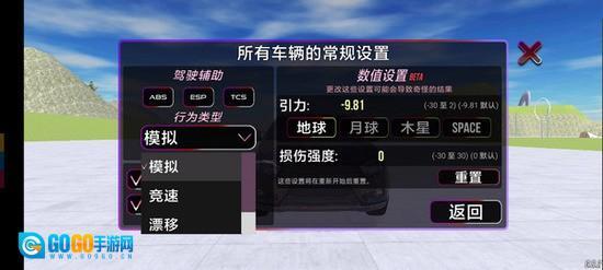 这里可以调整车辆碰撞时的各类效果参数,不妨把引力设置成木星的试试。