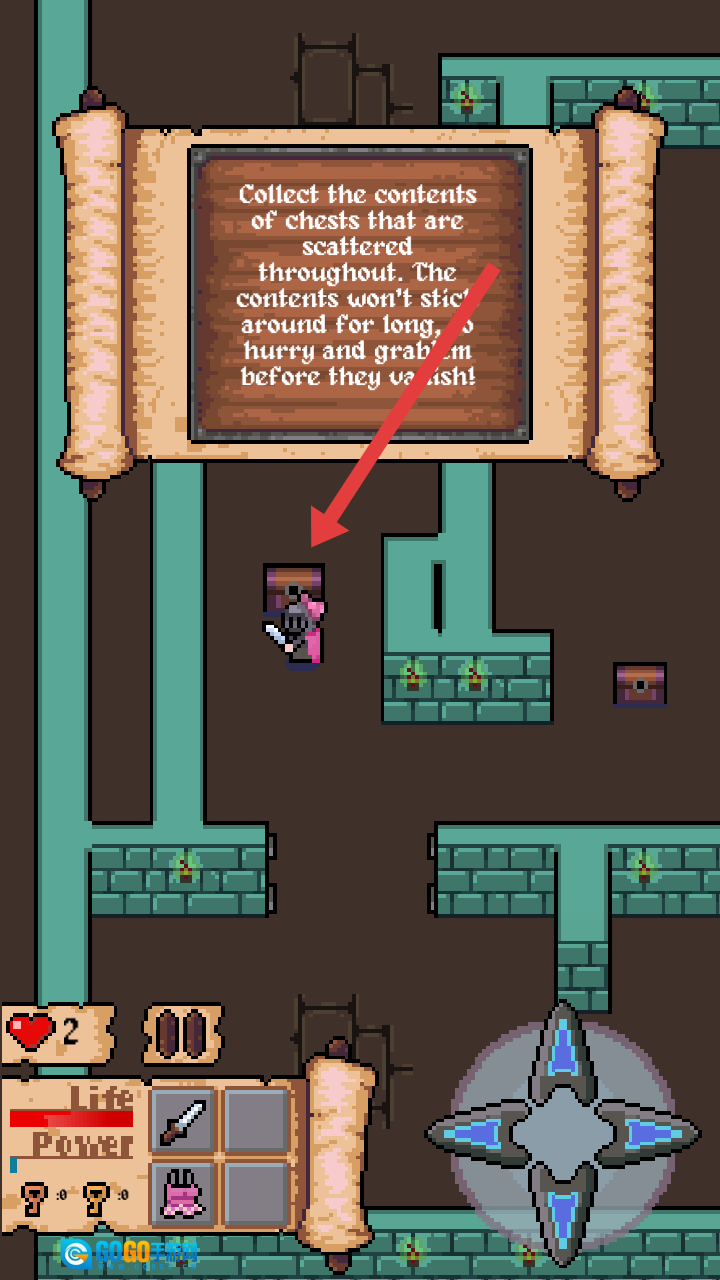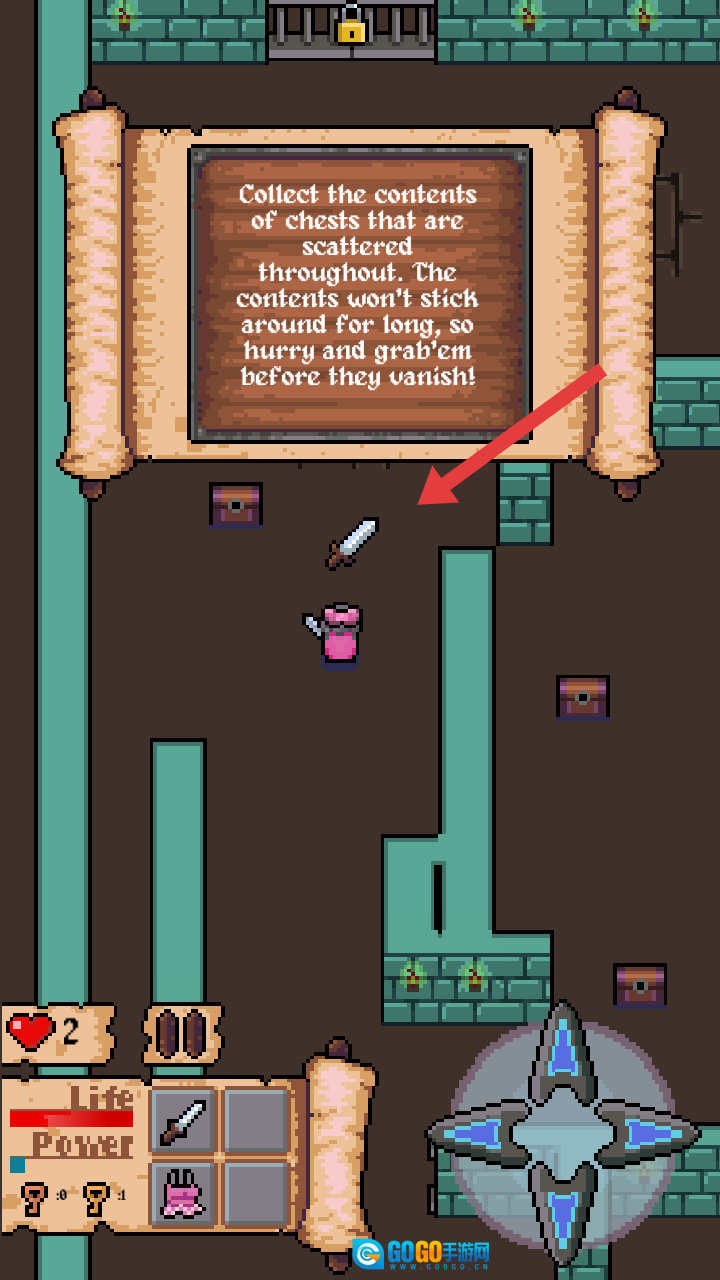 游戏内提示要收集那些会限时消失的散落宝箱中的物品,你可以用右下角的虚拟摇杆来控制角色,然后前往宝箱所在的位置。