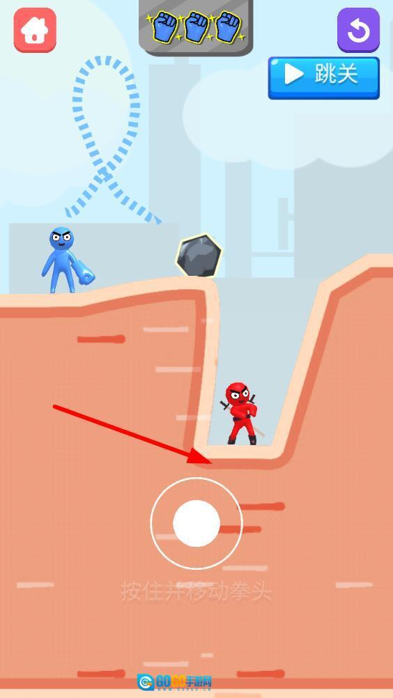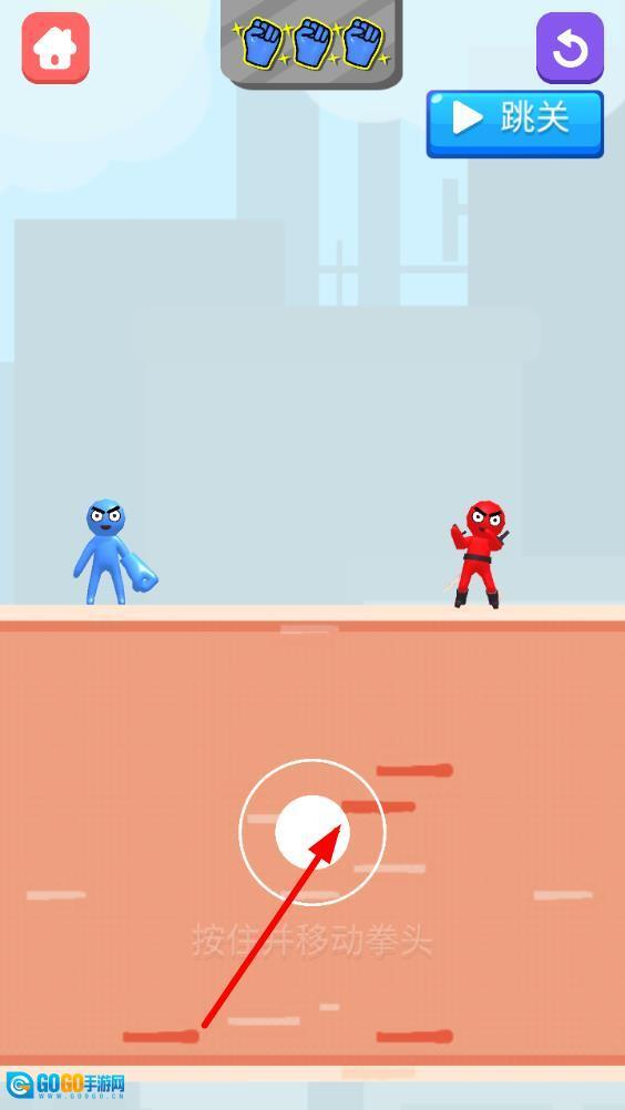 进入游戏后先选定初始关卡,留意小人的分布位置,用手指在屏幕上滑动来规划拳头的飞行路径,松开手指就能让拳头快速飞出,这样就开启了闯关的第一步。