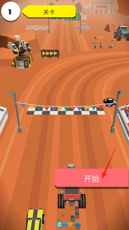 进入游戏的关卡界面后,能看到赛道和多辆赛车,点击开始按钮,赛车就会启动,在越野赛道上展开竞速。此时要让赛车驶入赛道,为操控赛车跨越障碍、争取胜利做好准备。