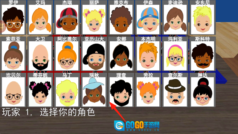玩家1处于角色选择界面时,点击箭头所指向的角色,选定自己将要猜测的人物后,进入对战环节。