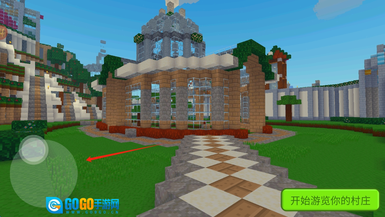在村庄界面,点击“开始游览你的村庄”按钮,借助左侧的虚拟摇杆来操控移动,以此探索村庄并熟悉周边环境。