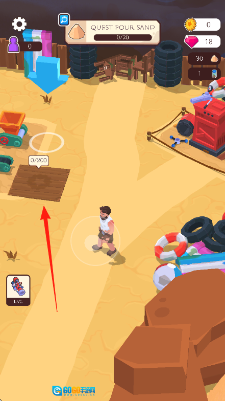 让角色顺着红箭头的指向移动,抵达指定区域后,开展与QUESPOURSAND任务相关的操作。