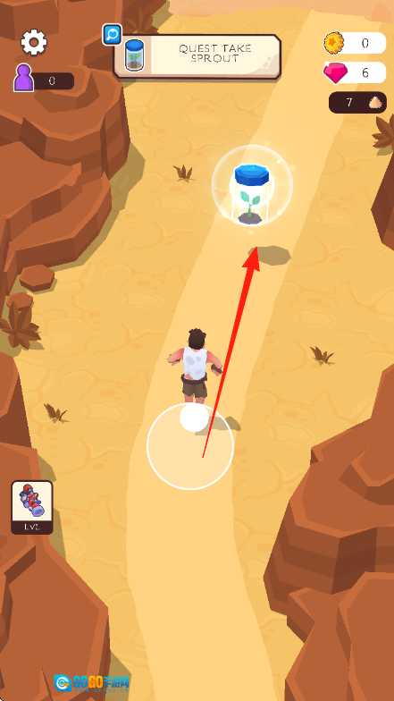 游戏进行中会出现各类不同的道具,你需要操控角色移动到红箭头指示的位置,拾取名为QUESTTAKESPROUT的任务物品。