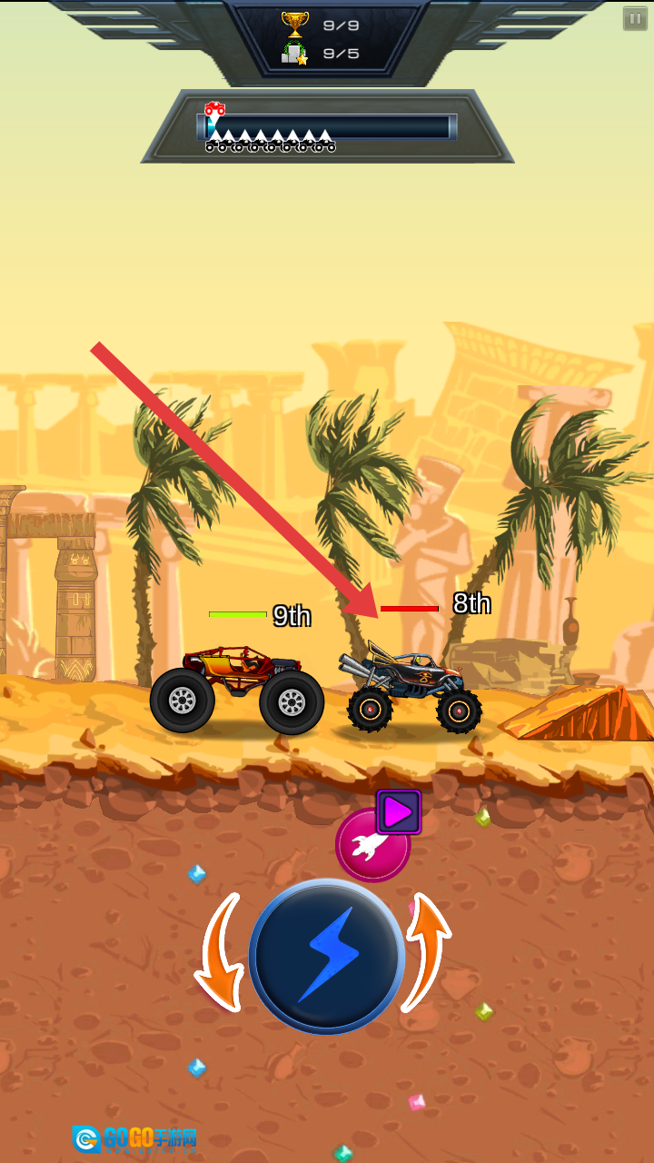 游戏开始时,你的赛车位于赛道第9位,点击底部的闪电按钮就能启动加速功能,试着超过排在第8位的前方黑色卡车。