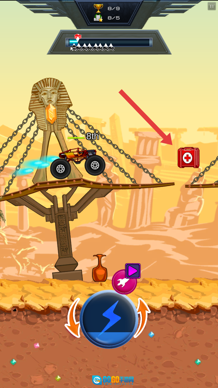 当行驶到斯芬克斯雕像附近的红色急救箱区域时,要优先拾取道具为车辆补充血量,以此增强自身的持续作战能力。