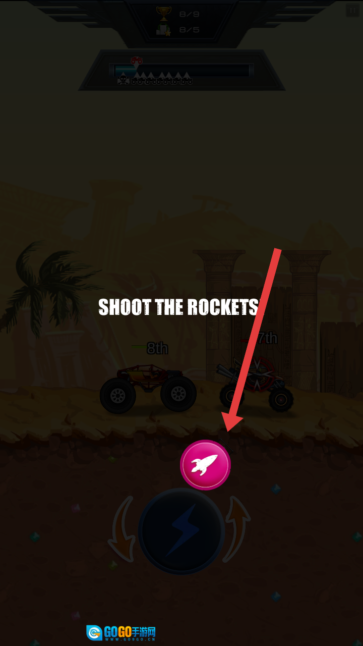 当界面出现“SHOOT THE ROCKETS”的提示时,点击粉色的火箭按钮,就能向对手发射火箭,以此干扰对方的行驶。