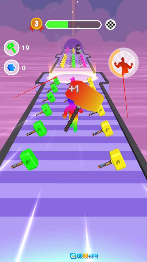 奔跑与合成同步进行:操控角色在赛道上不停奔跑,途中碰到同色锤子就主动靠近完成合成,使锤子的体积和威力逐渐增强,为应对接下来的挑战做好准备。