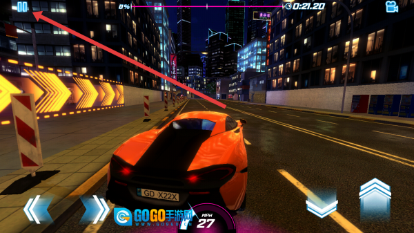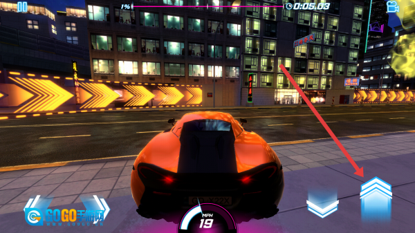 点击右侧的加速按钮,让橙色赛车在霓虹闪烁的城市街道上启动,开启这场竞速比赛,利用加速来抢占开局的优势。