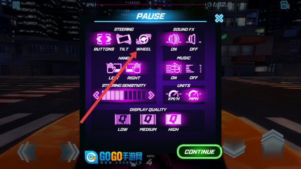 进入暂停菜单后,找到STEERING栏并选择WHEEL模式,以此切换赛车的操控方式,这样能更好地适配个人习惯,从而提升驾驶体验。