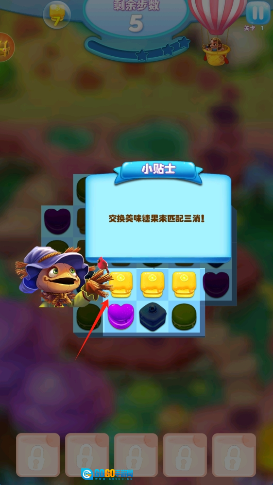 进入关卡界面后,留意糖果的排列情况,通过调换相邻糖果的位置,使三个及以上相同的糖果连成一条直线。