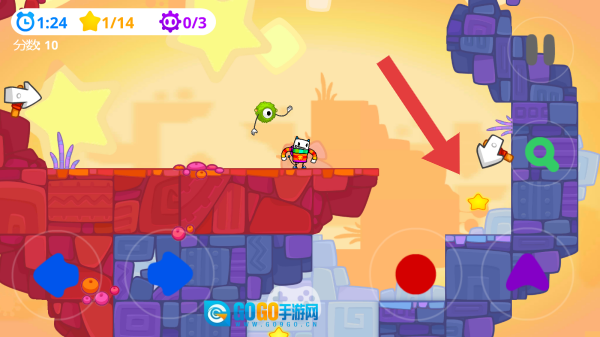 按照箭头的指示移动到这片区域,途中会碰到各式各样的障碍物,得依靠下方的跳跃和移动功能键来应对。