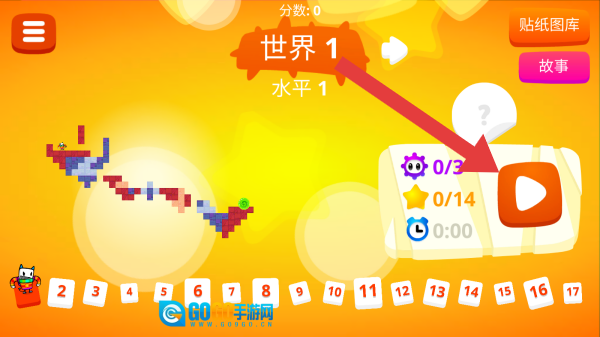 画面展示的是世界1的场景,当前玩家处于第一关,界面显示关卡为1-17,点击橙色的播放按钮即可进入游戏。