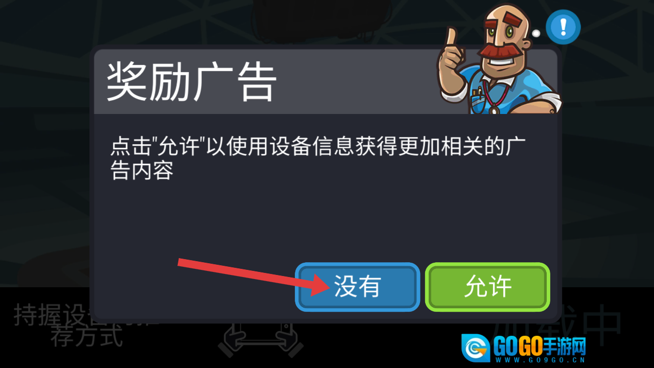 玩家启动游戏后,点击【没有】按钮就能关闭广告并进入游戏。