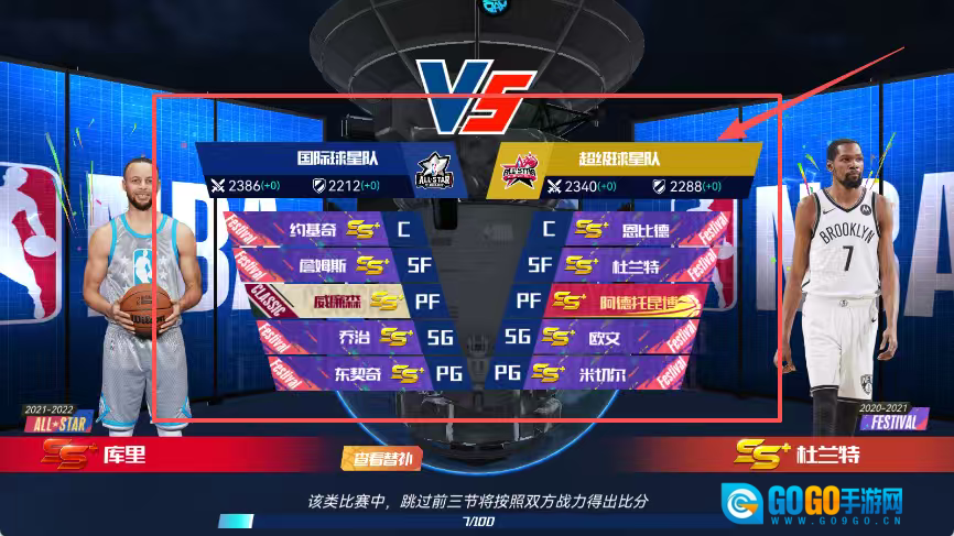 可以查看两队的战力值与首发阵容,同时了解“跳过前三节按战力比分”的比赛规则说明。