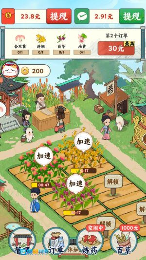 玩家能够挑选各类草药来栽种,熟悉每种草药的生长特点,科学安排自己的田地,培育出长势良好的草药。2、按照客户的订单栽种对应的草药,完成订单就能得到红包奖励。3、游戏里的订单任务多种多样,玩家可以依据自身的种植状况轻松开启。