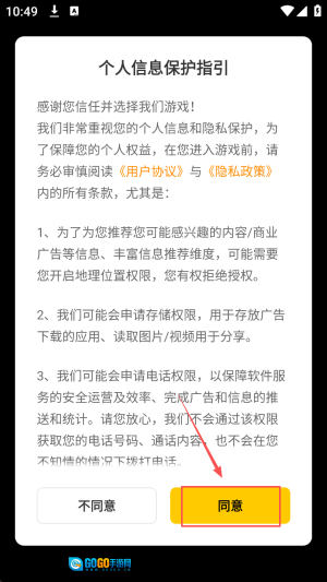 进入游戏的流程如下:先打开隐私政策相关界面,点击同意后即可进入游戏主界面。