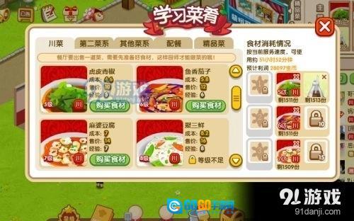 首先,我们先完成菜肴的设置。第一步是点击下方的黄色菜谱图标(具体位置可参考下图1),点击后会弹出下图2所示的界面。在这个界面中,您可以根据自己喜欢的菜品,消耗对应的材料并花费金币来完成设置。