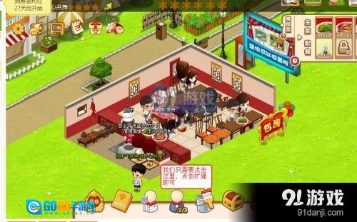 下一个任务是装修餐厅,点击如图所示的图标。待图二所示的界面出现后,我们就可以用金币购买所需的桌椅、厨具和装饰品等进行装饰。