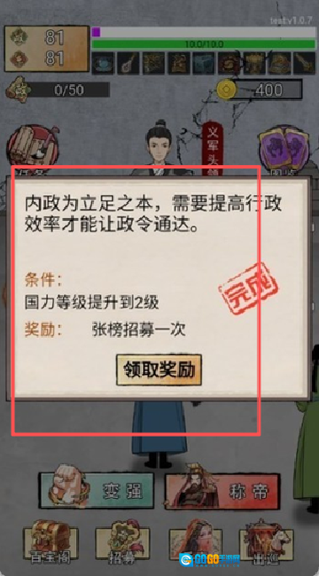 通过完成日常任务和开展资源建设来积累国力,与此同时招募拥有特殊能力的历史人物协助处理朝政。