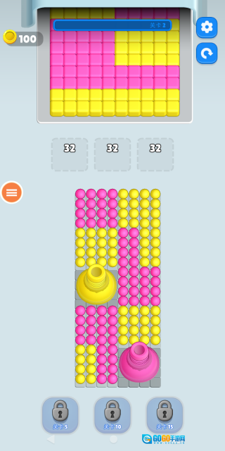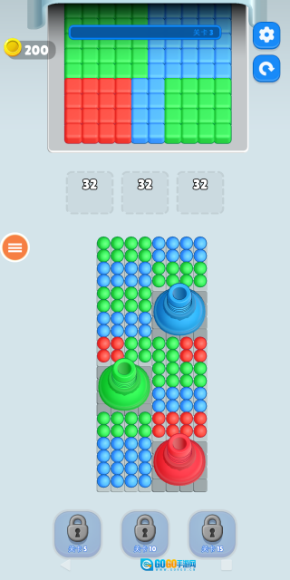 如下图所示,随着关卡难度的增加,方块的颜色种类会变多,数量也会有所提升,玩家需要巧妙地收集球球来击碎这些方块。