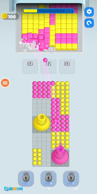 点击画面下方的彩色漏斗,就能收集对应颜色的球球,还能把球球弹射出去,击碎对应颜色的方块。