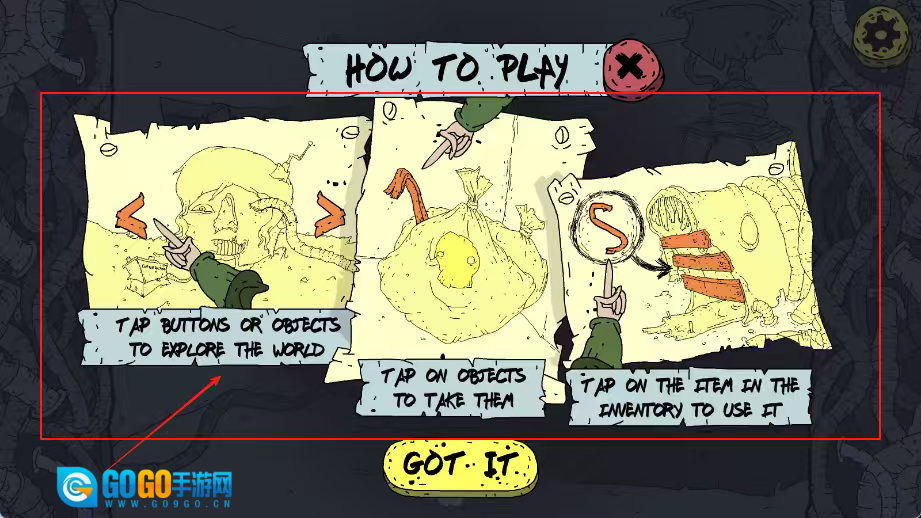 阅读操作说明后点击GOT IT确认,接着点击探索物品以拾取并使用道具,随后正式开启解谜环节。