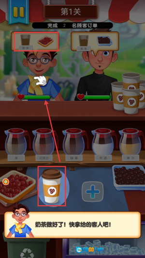 根据左侧顾客的订单来核对做好的成品,确认没有问题后,把饮品递给顾客,这样就能完成交易并获得收益。