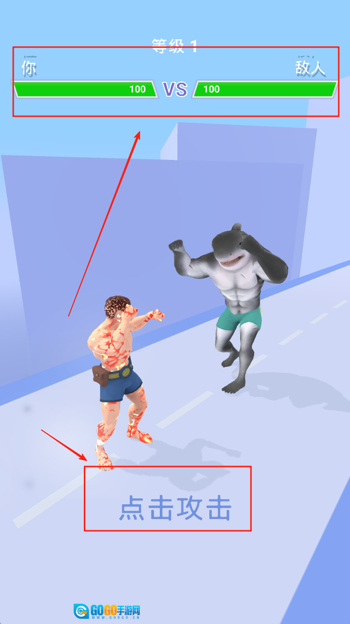 当遇到鲨鱼人这类敌人时,点击红色的攻击按钮就能开启战斗,要时刻留意双方的血量条,通过合理使用技能来获取胜利。