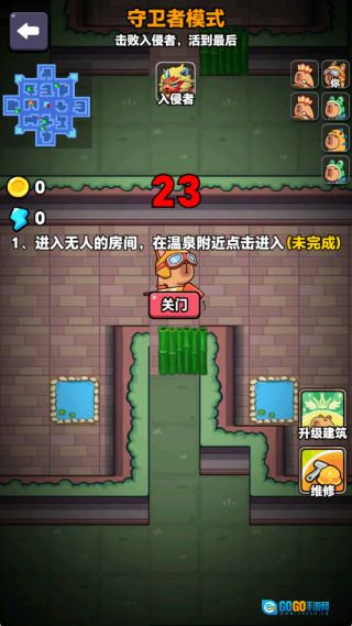 玩家需要先找到自己的房间并关上门,接着通过泡温泉获取收益,再快速建造炮塔来组建新的防线。